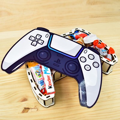 Sorprende a los amantes de los videojuegos con esta caja temática inspirada en el icónico mando de PlayStation. Su silueta y detalles gráficos reflejan fielmente los botones y acabados clásicos del controlador, lo que la convierte en un artículo atractivo tanto para decorar como para disfrutar de un delicioso surtido de chocolates Kinder.