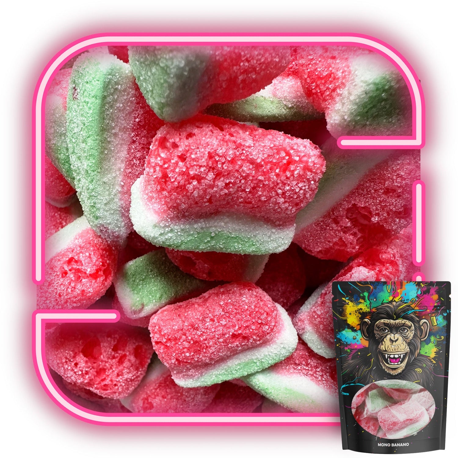 Explora la revolución de los dulces con nuestras Chuches Liofilizadas de Sandía. Vive una explosión de sabor y textura, con piezas que son hasta 5 veces más grandes que sus equivalentes originales. Cada tajada captura la esencia refrescante y jugosa de la sandía, transformando cada momento en una experiencia dulce memorable.