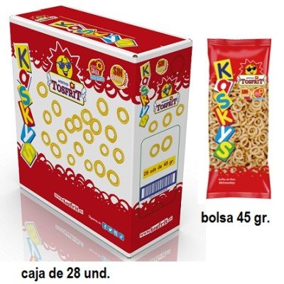 Nuestros aros de maíz fritos están disponibles en dos tamaños convenientes para satisfacer tus antojos. Puedes elegir entre la bolsa de 45 gramos, que viene en una caja de 24 unidades, o la bolsa de 120 gramos, que se presenta en una caja de 10 unidades.