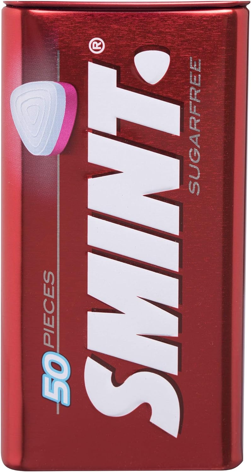 Caramelos comprimidos Smint Tin sin azúcar con delicioso sabor a Fresa. Cada lata contiene 12 paquetes de 35 gramos de caramelos comprimidos en un envase moderno y práctico.